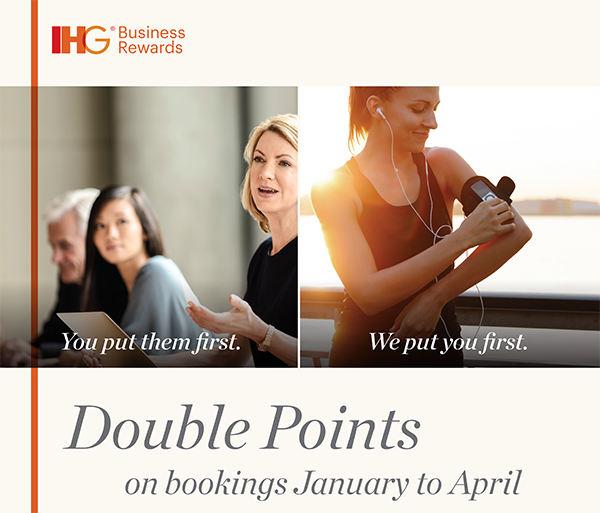 Earn twice as much for your bookings with IHG Business Rewards getting you closer to earning the recognition and rewards you deserve. Book with IHG Business Rewards between 1st January and 15th April 2017, for bookings consumed by 31st August 2017, to earn double points with Double Play.